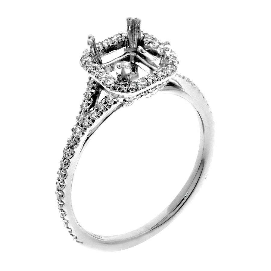 Halo ring with split shank emerald cut center
