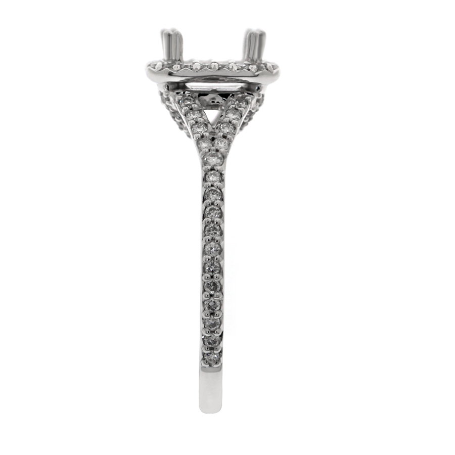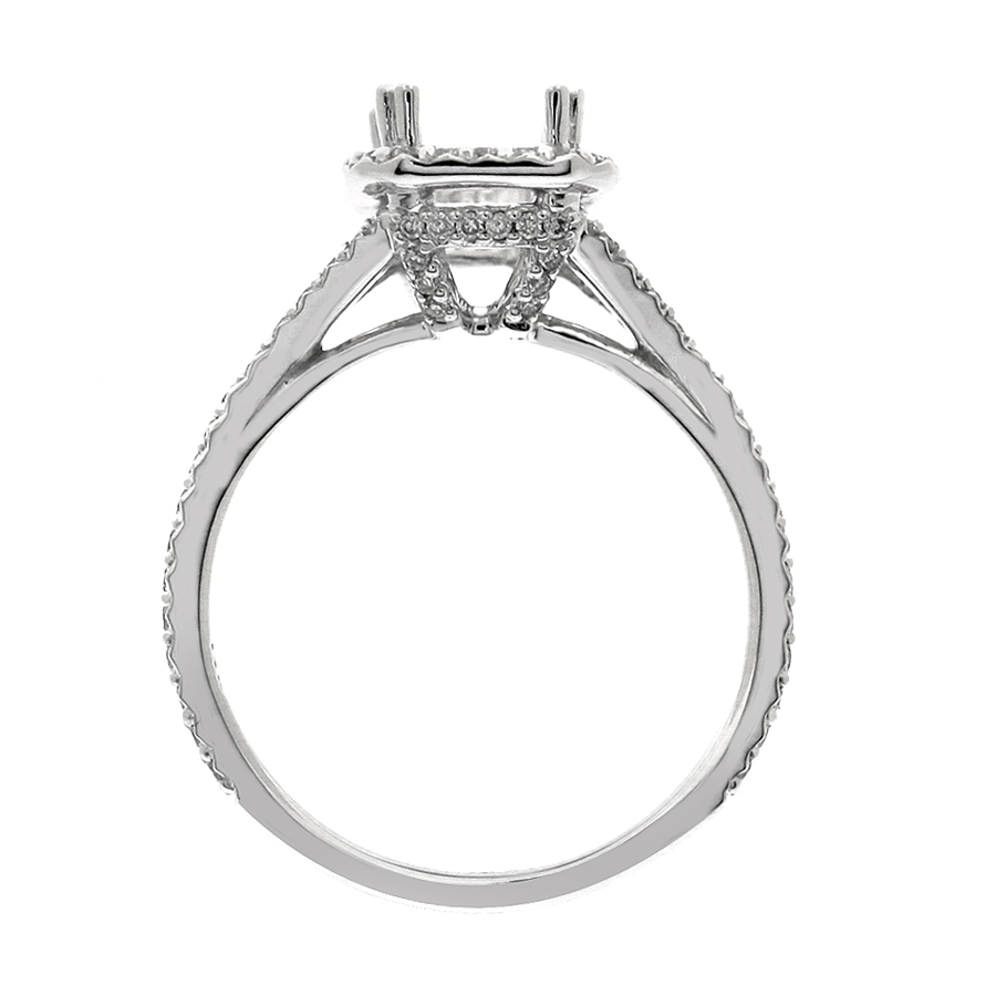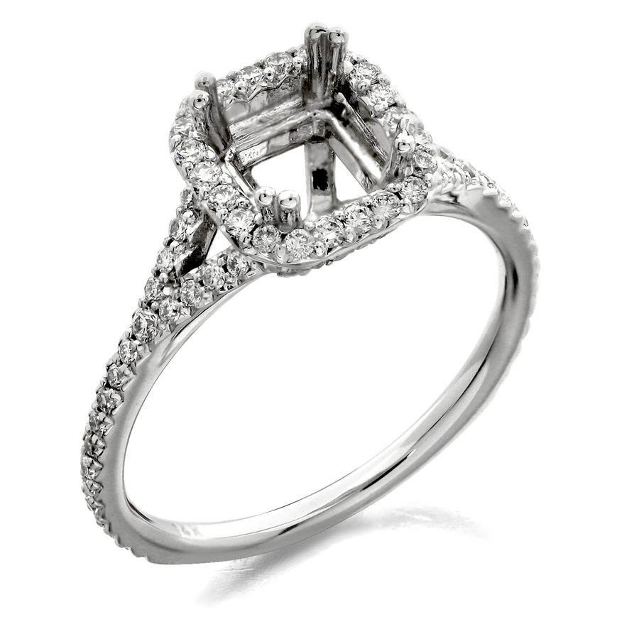 Halo ring with split shank emerald cut center