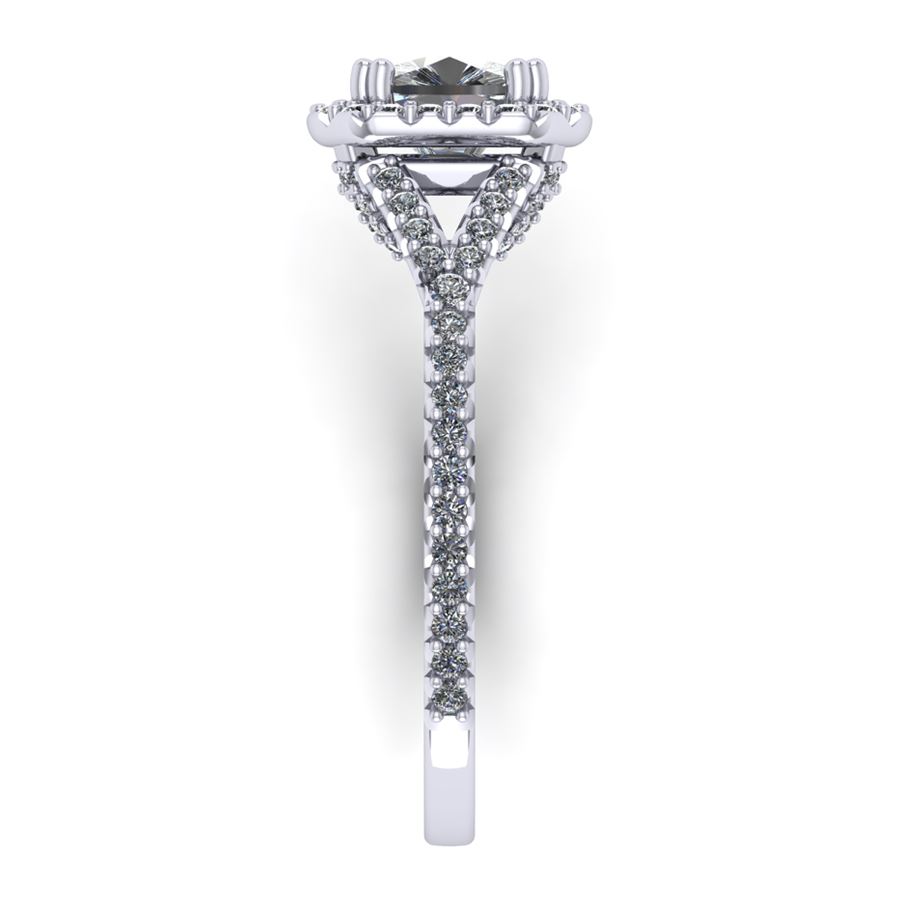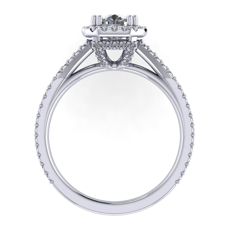 Halo ring with split shank emerald cut center